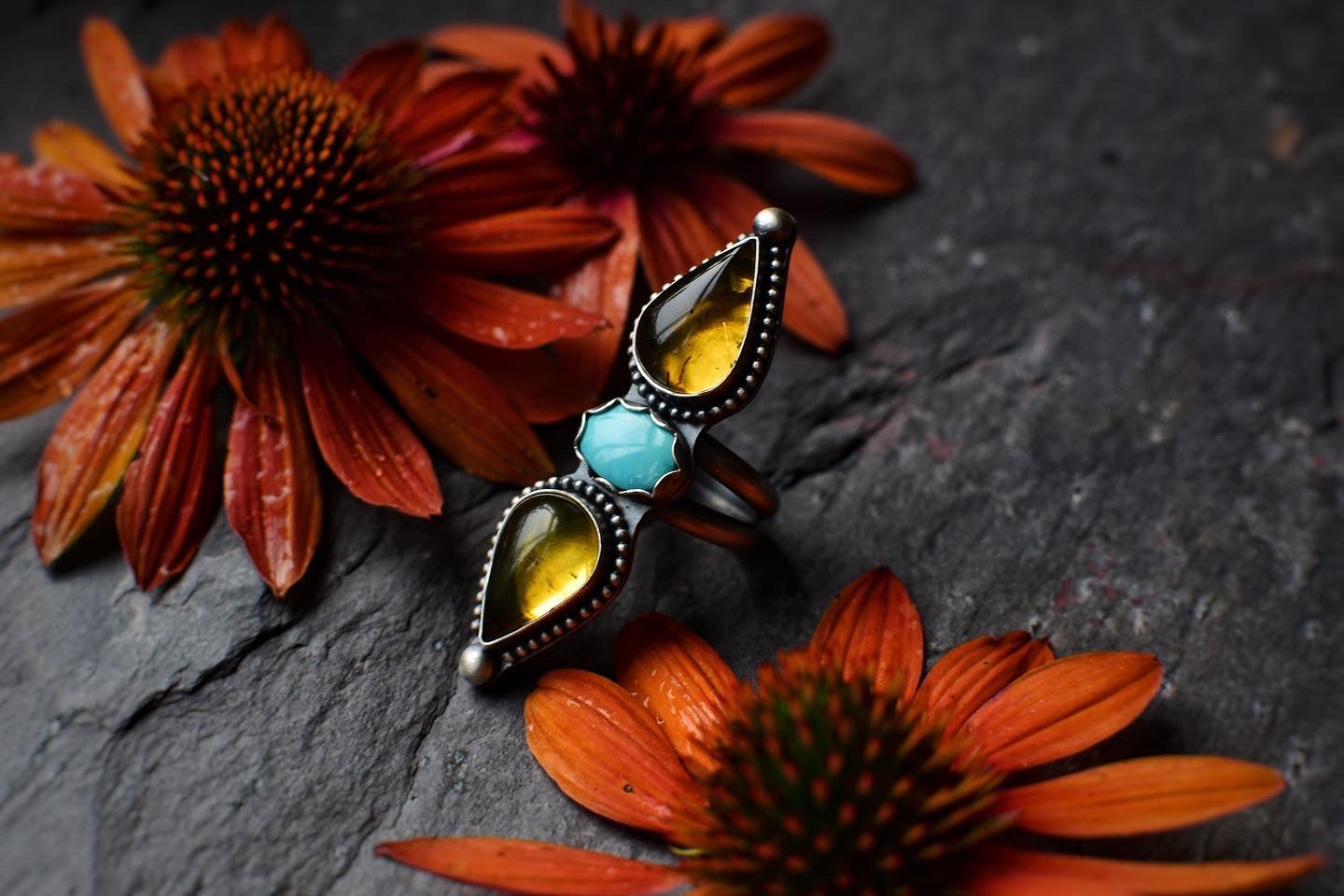 Amber and turquoise statement ring, Size 5.25