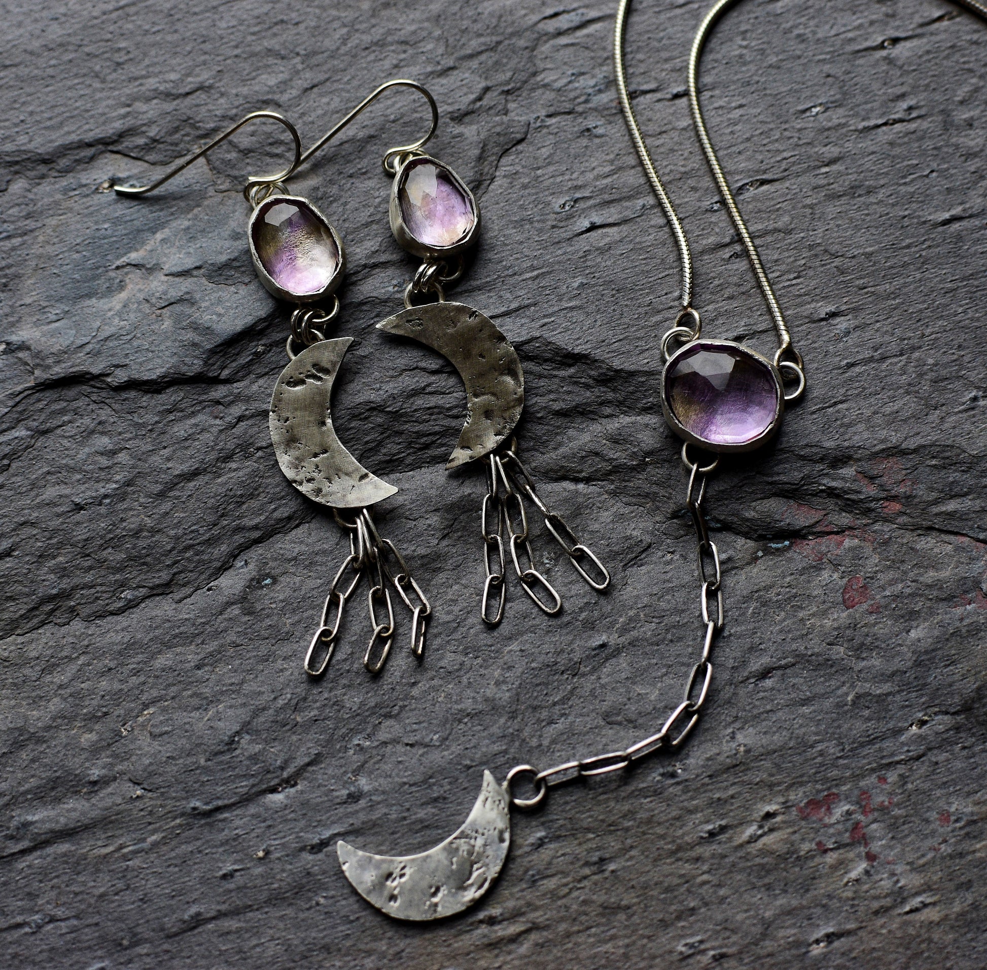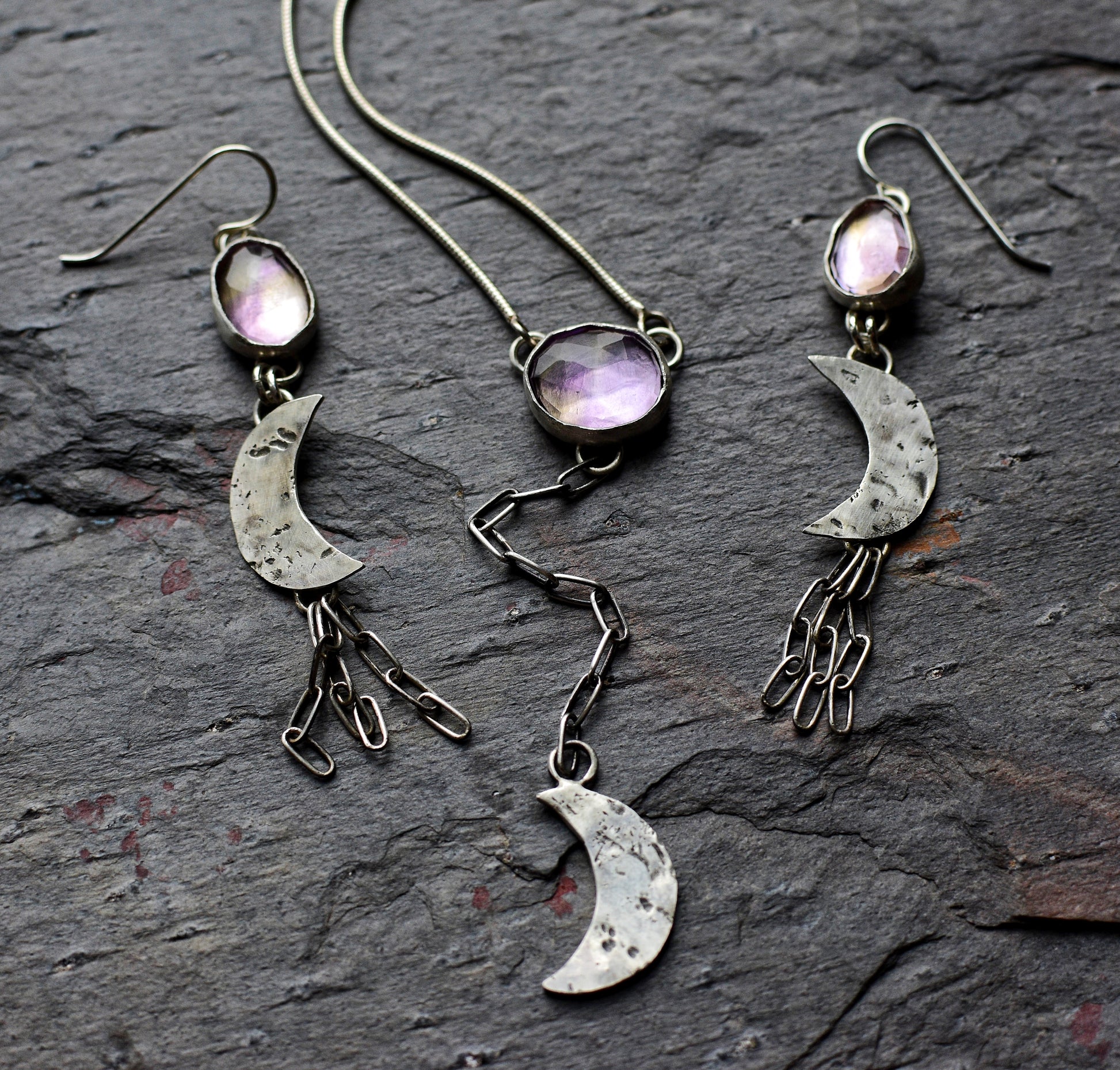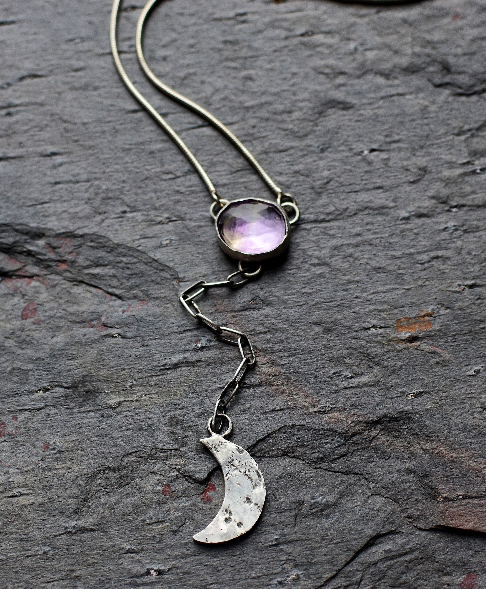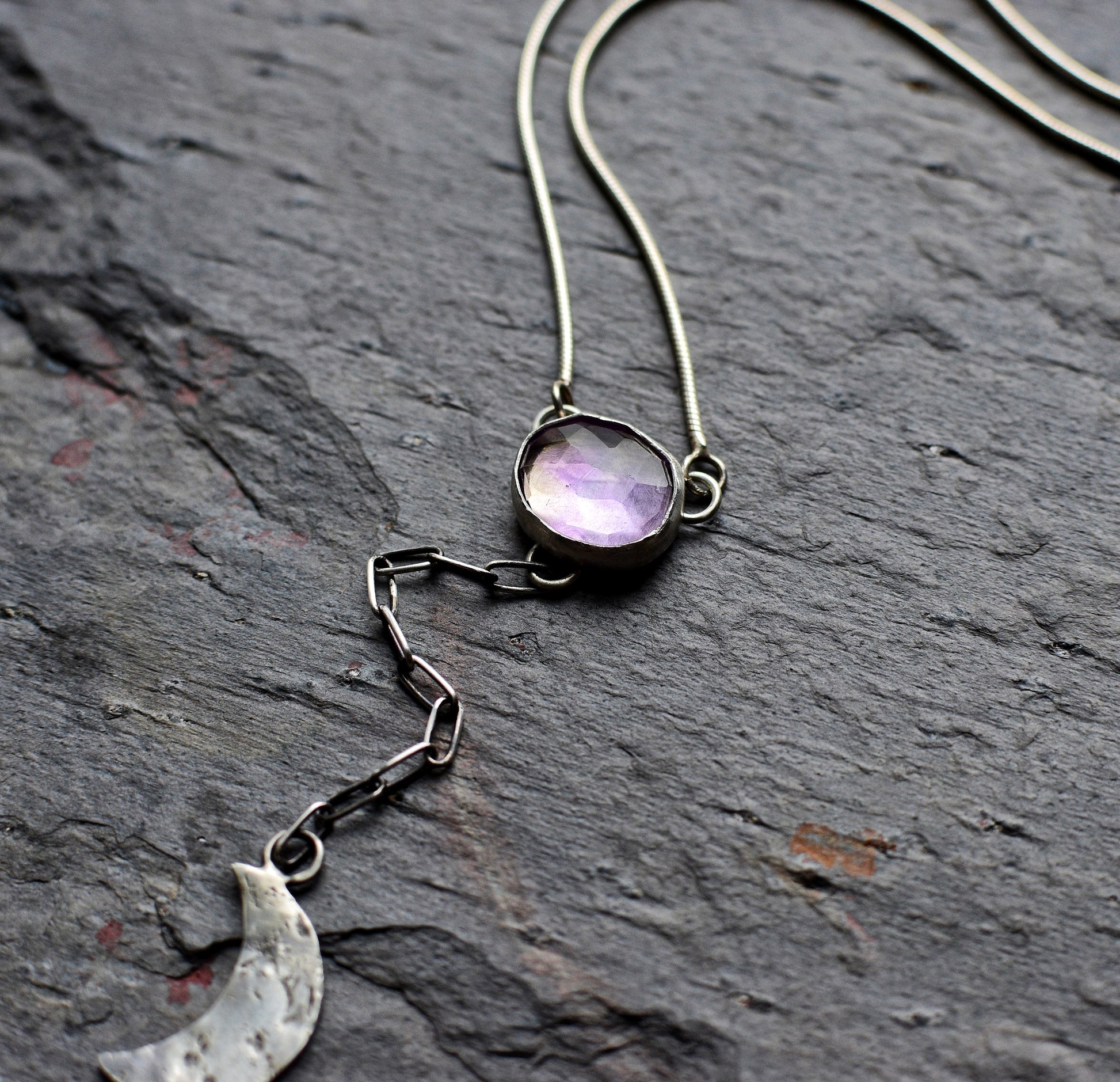 Sparkly Ametrine in hues of lavender and pale yellow set in fine and sterling silver, hand cut and textured silver crescent moon and chain detail for added movement. Necklace measures approximately 3.5” long.
