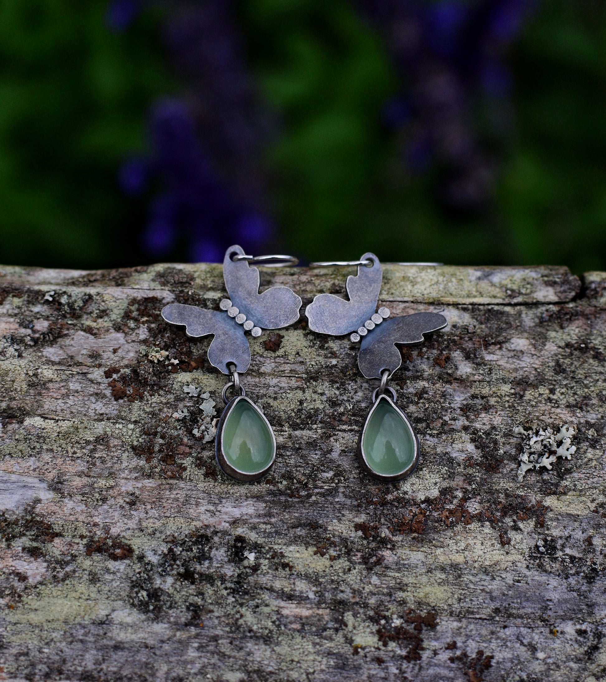 Hand sawn sterling silver butterfly earrings. Peridot teardrop stones. Lightweight. Sterling silver earwires. Earrings measure approximately 1.5” long. Patinead and polished for a soft matte finish.